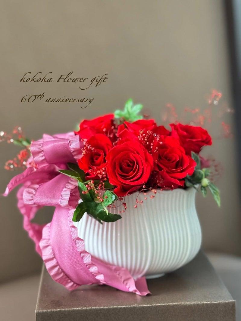 ありがとうございました。還暦退職の方は、私が、20代からの職場の知り合いで先輩です。2人で良く飲みにも行ってた仲でした。コロナもあり、出かける事が出来ず、何か贈りたいと悩んでいたらタイムラインで、ヒロコちゃんの、花時計が、目にとまりました。とても久しぶりだったけど、注文をお願いしました。還暦の先輩なので赤の花を基調にしてもらい、とってもステキな花時計を作成していただきました。先輩は、近くにいないたため送りたいと思います。